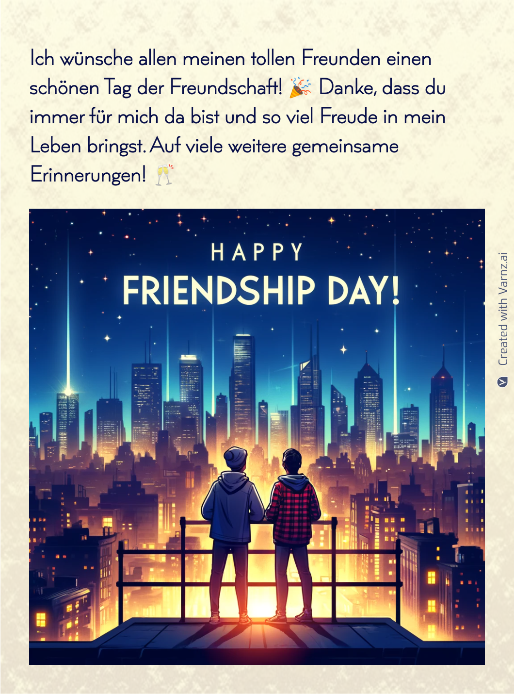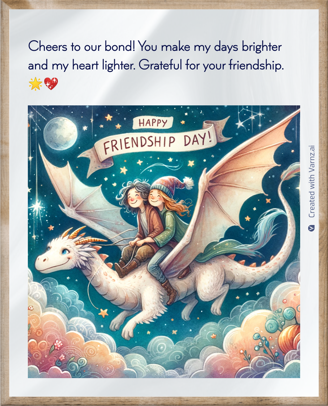 Are you tired of receiving the same "Happy Friendship Day" cards? This year, surprise your best friend with something unusual! Varnz's AI funny frienship cards create personalized messages beyond basic greetings.