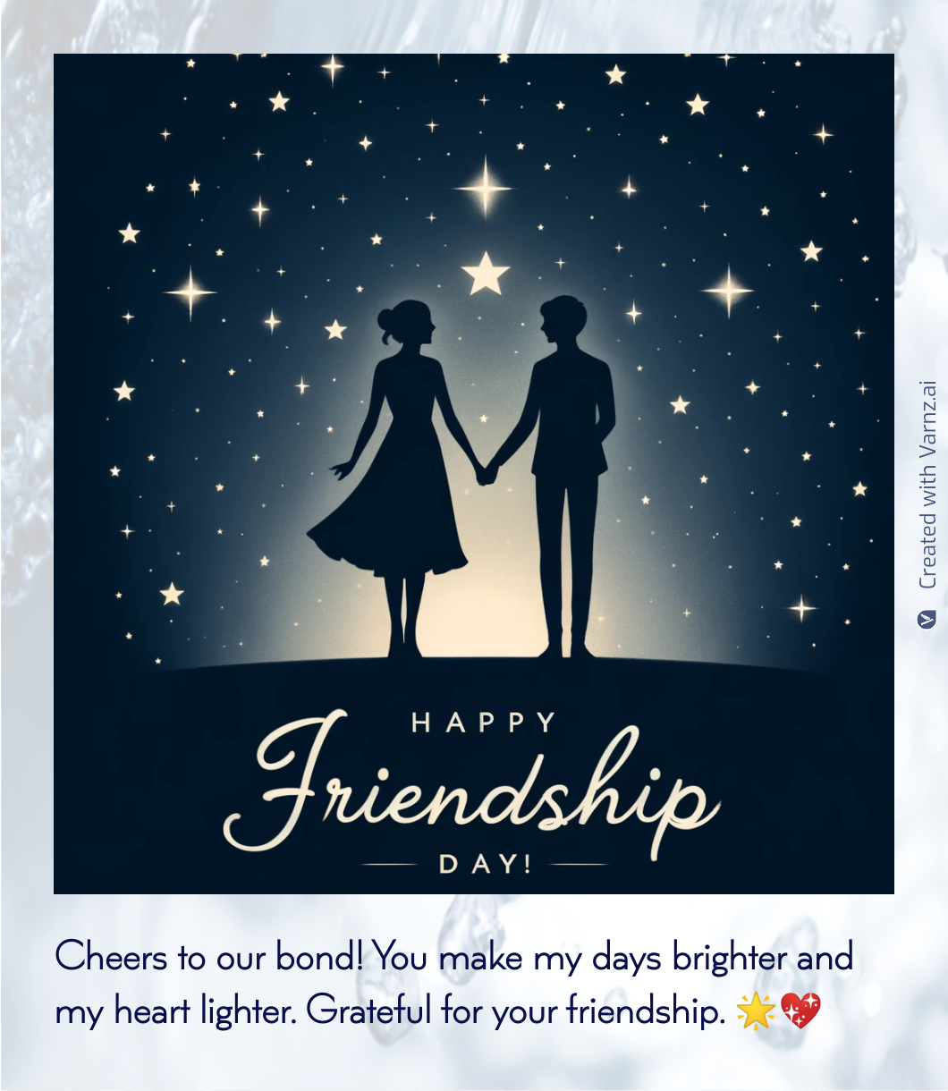 Yes, Varnz facilitates the digital sharing of your AI Generated Friendship Day cards via WhatsApp and Twitter. Simply download the digital file and spread the joy of Friendship Day with your friends, no matter where they are.